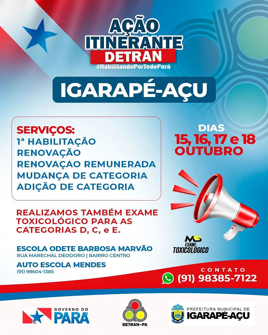 A equipe do DETRAN estará realizando os serviços de 1º habilitação, renovação, renovação remunerada, mudança de categoria, adição de categoria. O laboratório MS estará presente para a realização do exame toxicológico.