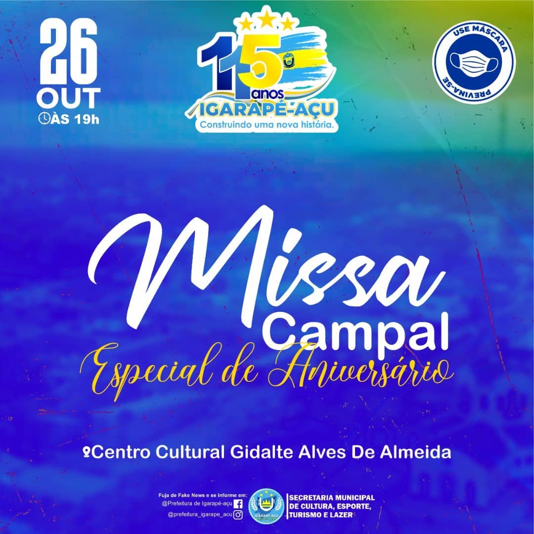 Os 115 anos do nosso município se aproxima e a Prefeitura de Igarapé-Açu, vem convidar (a)os igarapé-açuense para participar da MISSA CAMPAL, que acontecerá no dia 26 de outubro de 2021 às 19h na Praça do Centro Cultural Gidalte Alves de Almeida.