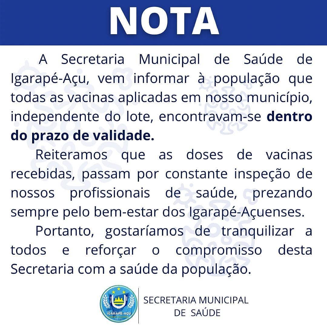 A Secretaria Municipal de Saúde de Igarapé-Açu, vem informar à população que todas as vacinas aplicadas em nosso município, independente do lote, encontravam-se dentro do prazo de validade.