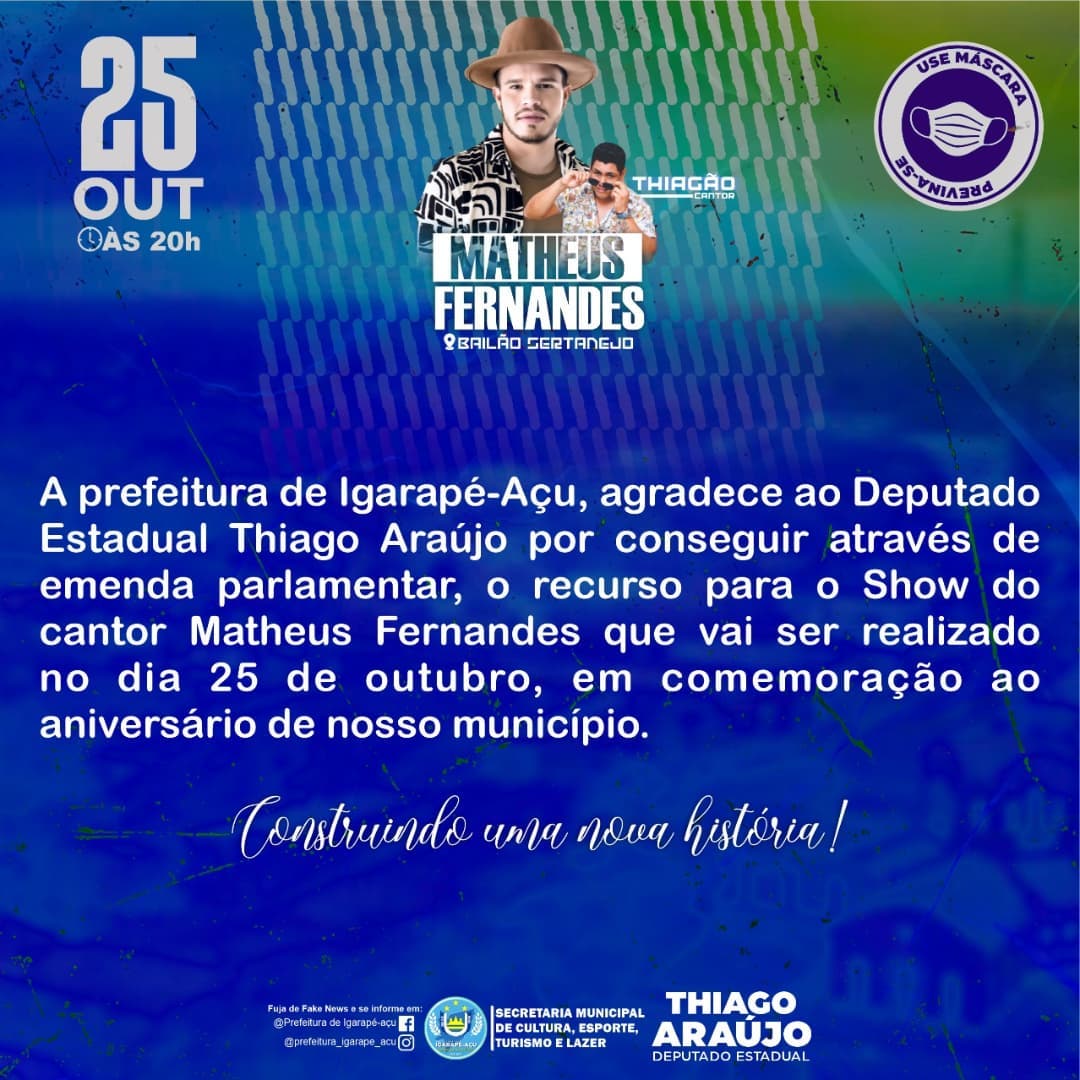A prefeitura de Igarapé-Açu, agradece ao Deputado Estadual Thiago Araújo por conseguir através de emenda parlamentar, o recurso para o Show do cantor Matheus Fernandes que vai ser realizado no dia 25 de outubro, em comemoração ao aniversário de nosso município.