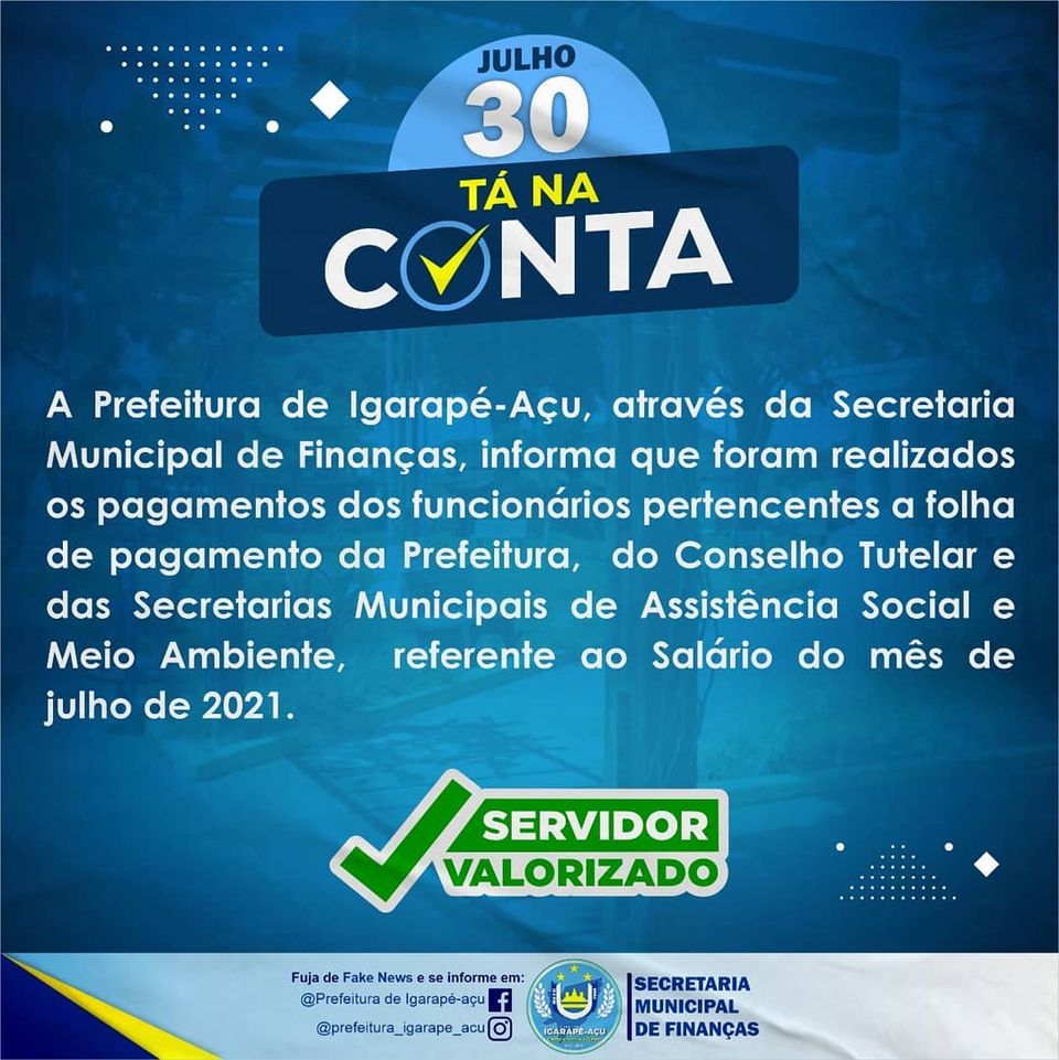 A Prefeitura de Igarapé-Açu, através da Secretaria Municipal de Finanças, informa que foram realizados os pagamentos dos funcionários pertencentes a folha de pagamento da Prefeitura, do Conselho Tutelar e das Secretarias Municipais de Assistência Social e Meio Ambiente, referente ao Salário do mês de julho de 2021.